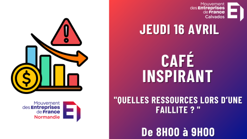 AGENDA Posté le 17 mars 2026 à 14h09 JEUDI 16 AVRIL : CAFÉ INSPIRANT CAFÉ INSPIRANT Thème : "Quelles ressources lors d’une faillite ? " EN VISIO Horaires : 8H00 à 9H00
