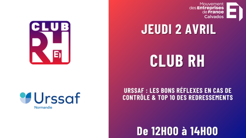 AGENDA Posté le 17 mars 2026 à 14h01 JEUDI 2 AVRIL : CLUB RH CLUB RH URSSAF : les bons réflexes en cas de contrôle & top 10 des redressements Lieu : Medef Calvados Horaires : 12H00 à 14H00