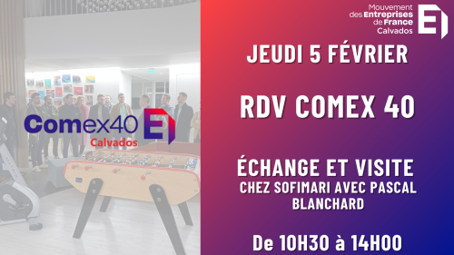 AGENDA Posté le 9 décembre 2025 à 15h51 JEUDI 5 FÉVRIER : RDV COMEX40 RDV COMEX40 Échange et visite chez SOFIMARI avec PASCAL BLANCHARD, suivi d'un déjeuner. Horaires : 10H30 à 14H00