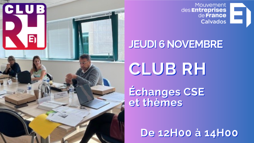 AGENDA Posté le 7 octobre 2025 à 15h36 JEUDI 6 NOVEMBRE : CLUB RH CLUB RH Échanges CSE et thèmes 2026 Horaires : 12H00 à 14H00 Lieu : Medef Calvados, 10 Rue Alfred Kastler, 14000 Caen