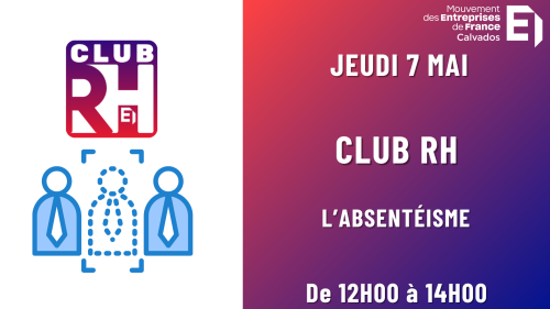 AGENDA Posté le 17 mars 2026 à 14h28 JEUDI 7 MAI : CLUB RH CLUB RH Thème : L'absentéisme Lieu : Medef Calvados Horaires : 12H00 à 14H00