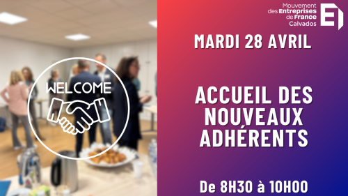 AGENDA Posté le 17 mars 2026 à 14h11 MARDI 28 AVRIL : ACCUEIL NOUVEAUX ADHÉRENTS ACCUEIL NOUVEAUX ADHÉRENTS Petit-déjeuner en présence de toute l'équipe du MEDEF Calvados Lieu : Medef Calvados Horaires : 8H30 à 10H00