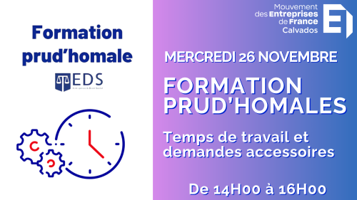 AGENDA Posté le 7 octobre 2025 à 16h15 MERCREDI 26 NOVEMBRE : FORMATION PRUD'HOMALE FORMATION PRUD'HOMALE Horaires : 09H00 à 17H00 Lieu : Medef Calvados, 10 rue Alfred Kastler, Caen 14000